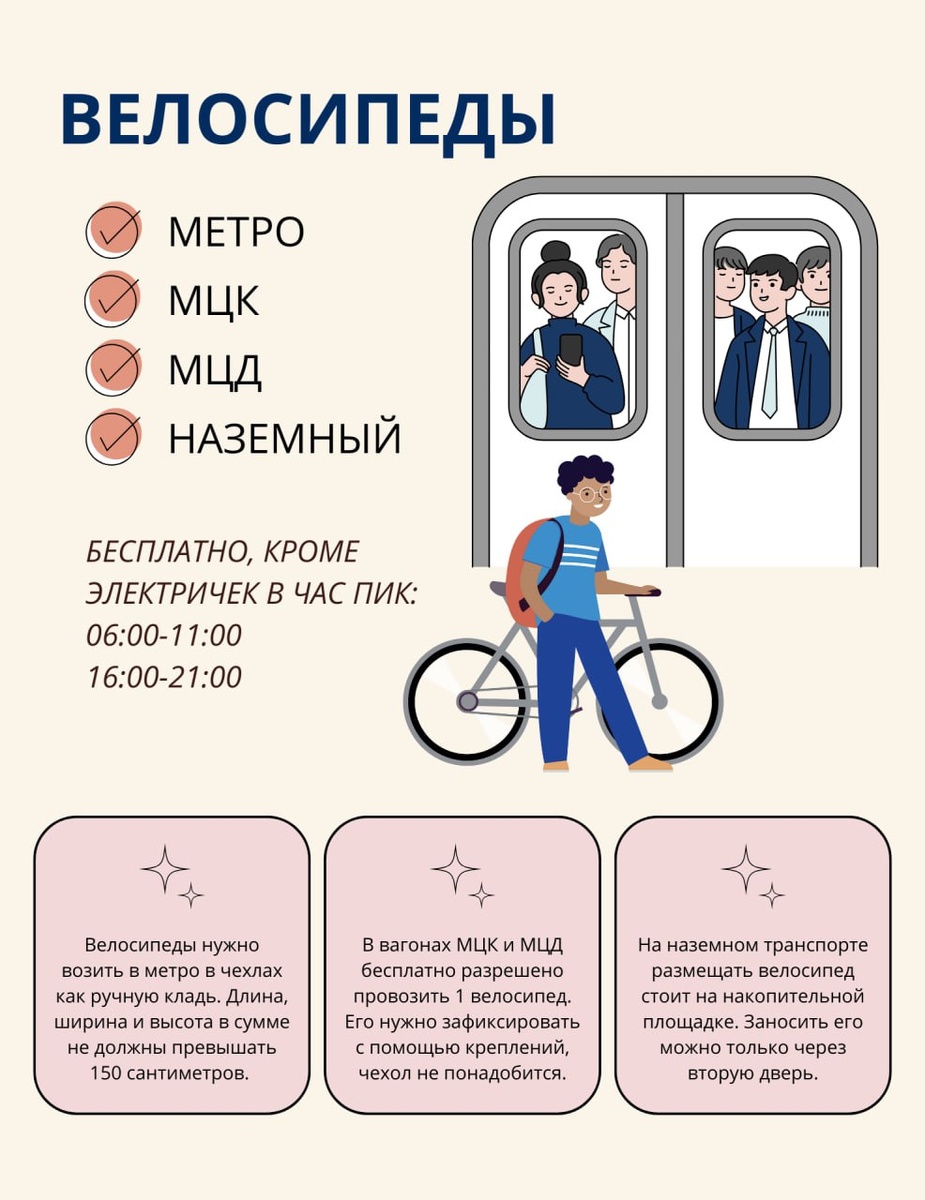 Катимся в тёплый сезон! ☀️ Велосипеды, самокаты, сегвеи, гироскутеры – на всём этом погода уже позволяет разъезжать по Москве. Но если расстояния большие, иногда приходится пользоваться общественным транспортом. ❓ Как перевозить свои средства передвижения? ❓ Можно ли вообще с ними в метро, МЦК и МЦД? ❓ Придётся ли платить? ❓ Как правильно размещать в салоне? Подготовили ответы - в карточках. Подпишитесь на Супер Тройку