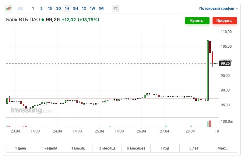 На момент объявления этой новости акции ВТБ стоили около 86 рублей, то есть, дивидендная доходность от этой цены получалась вообще сумасшедшая - около 30%. Акции сразу же начали активно покупать, их цена взлетела более чем на 25% до 109 рублей, ЦБ пришлось даже объявлять дискретный аукцион.