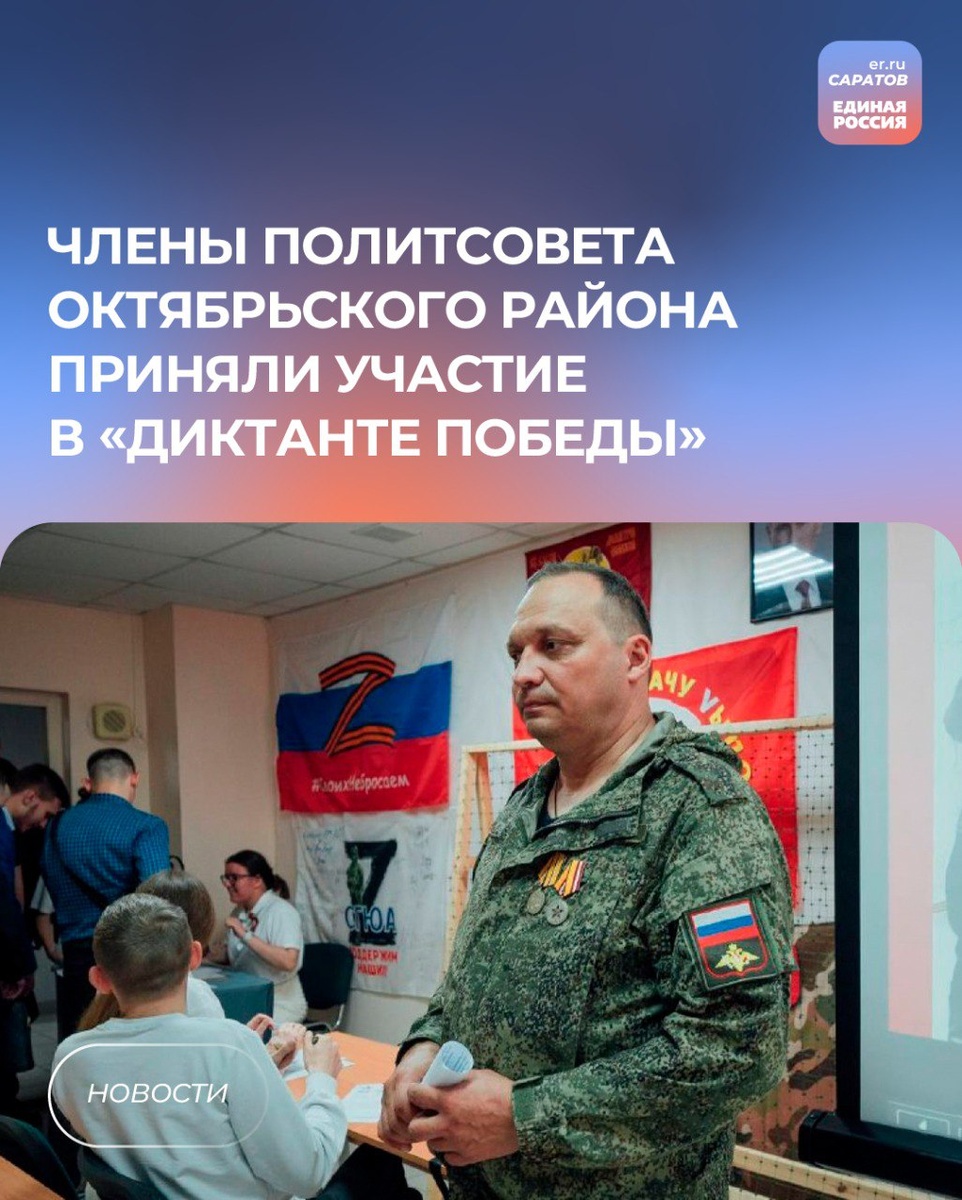✍🏼 Члены местного политсовета Октябрьского местного отделения партии «Единая Россия» приняли участие в международной исторической акции «Диктант Победы». В этом году «Диктант Победы» охватывает рекордное количество площадок – более 35 тысяч по всей России, а также 89 стран мира. 💬«Я не только написал «Диктант Победы», но и выступил организатором площадки в гуманитарном штабе СГЮА. Приятно было видеть в числе участников, волонтёров, которые активно помогают в зоне СВО и наряду с нашими бойцами куют победу», - поделился Олег Мысов.