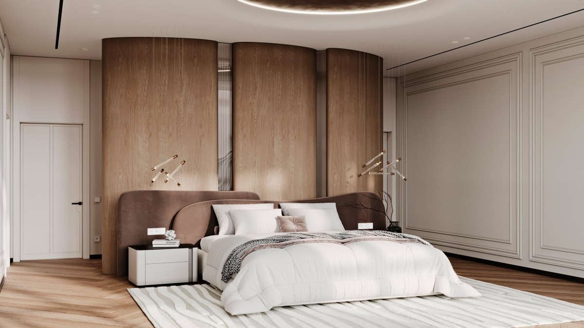 Квартира 500 м². Часть 2 – Спальня🌙 Продолжаем знакомство с квартирой: мастер-спальня объединяет зону отдыха, гардеробную и ванную в единый гармоничный ансамбль. Кровать ориентирована прямо на окно – чтобы каждый новый день начинался с мягкого света и ощущения простора. Телевизор органично встроен в интерьер: он стоит на тумбе напротив кровати, не загромождая пространство. Одной из ключевых находок стало мягкое объемное изголовье кровати и декоративные панели . Они не только украшают зону сна, но и отделяют её: за выступами скрыты проходы в мастер-ванную и гардеробную. Такое решение добавляет уединённости и делает спальню по-настоящему камерной. 💡 В гардеробной мы разместили отдельный остров-комод и витринные шкафы с тёплой подсветкой. Мечта каждой женщины🖇️ Спальня получилась гармоничной и очень личной – уютное место, чтобы замедлиться и восстановиться после насыщенного дня. Следите за серией постов, впереди ещё детские комнаты и кухня-гостиная.