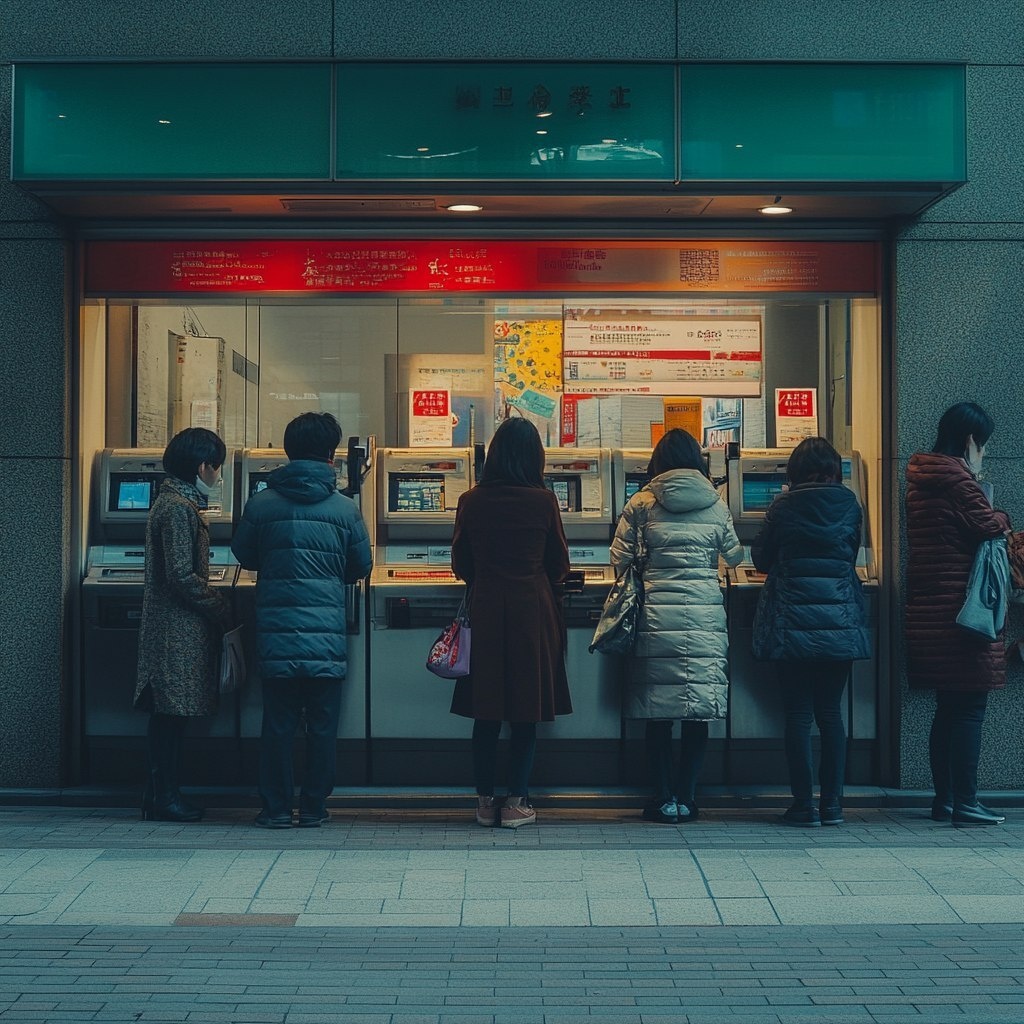Создано на основе запроса: A line of Asian people waiting at outdoor ATM machines, captured from camera angle, wide-angle shot with slight