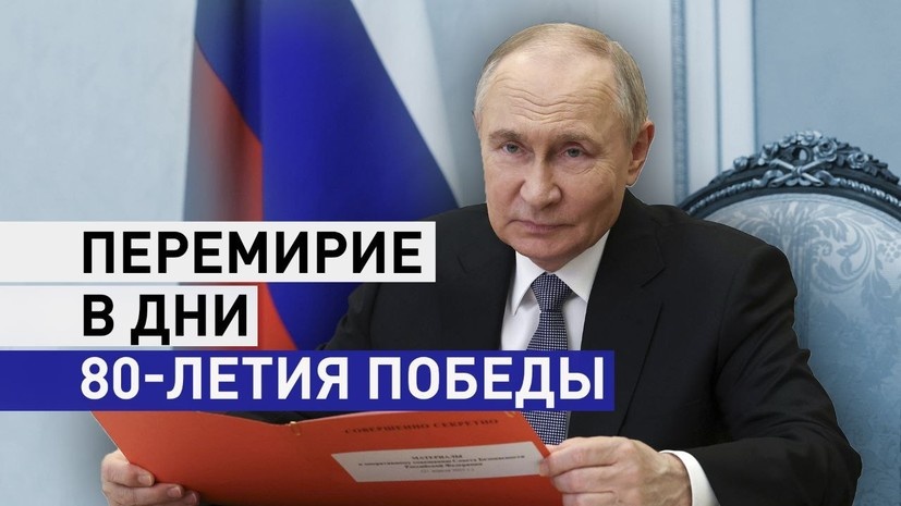 Владимир Путин объявил перемирие в дни празднования 80-й годовщины Победы. Оно будет длиться с нуля часов с 7 на 8 мая до нуля часов с 10 на 11 мая. На этот период останавливаются все боевые действия. Москва считает, что Киев должен последовать её примеру. В Кремле сообщили, что в случае нарушений перемирия украинской стороной ВС РФ дадут адекватный и эффективный ответ. Подробнее — в видео RT.