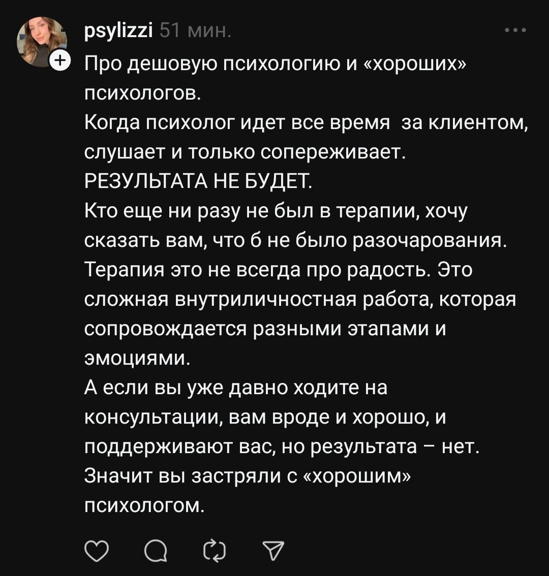 Я конфронтирующий спец- это факт. Существует множество мифов, что психолог должен всегда поддерживать. Это не так. Я поддерживаю в тяжёлые моменты, но конфронтирую с заблуждениями и неадаптивными паттернами. Но я фрустрирую деструктивное поведение из любви к человеку, а не из желания самоутверждения и желания сделать больно. Но это больно для психики клиента. Сначала. А потом наступает освобождение. Самые мощные интервенции для личностного роста я использую на группах.