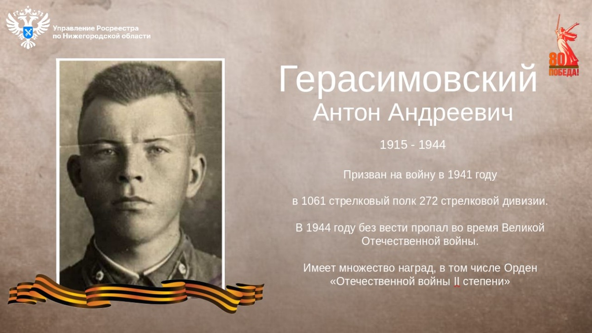 🥁"Лица Победы - онлайн" Герасимовский Антон Андреевич призван на войну в 1941 году в 1061 стрелковый полк 272 стрелковой дивизии. В 1944 году без вести пропал во время Великой Отечественной войны. 🎖🏅Имеет множество наград, в том числе Орден «Отечественной войны II степени» #мыпомним #мыгордимся #Победа80 #УРР52 #Росреестр52 #лицаПобеды