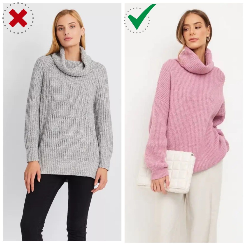Знаю, что многие любят именно этот тип воротника, ведь он создаёт впечатление тёплого и согревающего. Но на самом деле, если надеть такой свитер, как слева, смысла в хомуте вообще нет.