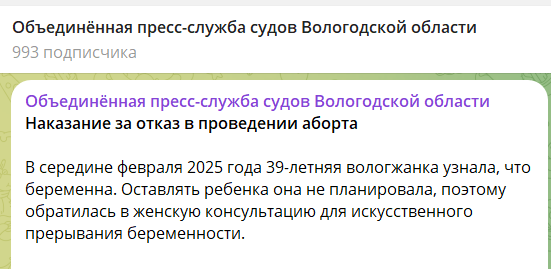 Мировой судья судебного участка №11 в Вологде признал виновной исполняющую обязанности главного врача городского роддома за отказ провести пациентке аборт и оштрафовал ее на 15 тысяч рублей. Об этом сообщила объединенная пресс-служба судов региона. По данным пресс-службы, в феврале этого года 39-летняя вологжанка узнала, что беременна. Оставлять ребенка она не планировала, поэтому обратилась в женскую консультацию для искусственного прерывания беременности. Там женщина прошла консультацию с психологом, сделала УЗИ, сдала анализы и была направлена в городской роддом. Сообщается, что 25 февраля женщина приехала в стационар, расположенный на улице Пирогова, однако получила отказ в аборте. Тогда вологжанка написала жалобу на имя главного врача роддома и уехала домой. «Просто без причины, без объяснений развернули, отправили домой. На каком основании — не знаю. Главврач отказалась выйти и что-либо объяснить мне. Чувствую обиду, злость, непонимание, незащищенность. Вот так нас лишают прав! С