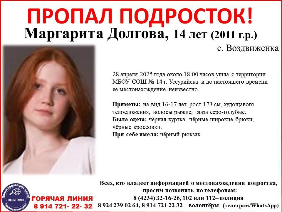 ВНИМАНИЕ! ПРОПАЛ ПОДРОСТОК! Маргарита Долгова, 14 лет (2011 г.р.) с. Воздвиженка 28 апреля 2025 года около 18:00 часов ушла с территории МБОУ СОШ № 14 г. Уссурийска и до настоящего времени ее местонахождение неизвестно. Приметы: на вид 16-17 лет, рост 173 см, худощавого телосложения, волосы рыжие, глаза серо-голубые. Была одета: чёрная куртка, чёрные широкие брюки, чёрные кроссовки. При себе имела: чёрный рюкзак. Всех, кто владеет информацией о местонахождении подростка, просим позвонить по телефонам: 8 (4234) 32-16-26, 102 или 112– полиция 8 924 239 02 64, 8 914 721 22 32 – волонтёры (телеграм/WhatsApp) #поиск_Долгова Барахолка: @uss_baraholka Подписка: @Mark2_chee