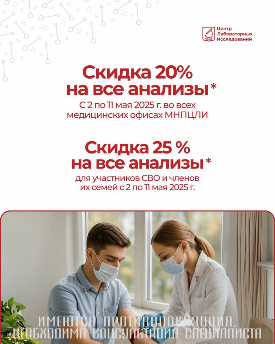 Весенние скидки на заботу о здоровье! С 2 по 11 мая 2025 года в медицинских офисах МНПЦЛИ действует специальное предложение: 🔴Скидка 20% на лабораторные анализы* 🔴Скидка 25% для участников СВО и членов их семей* Подарите себе уверенность в своём здоровье — сдайте необходимые анализы с выгодой. Быстро, профессионально и без очередей🫶 ➡️ Анализы можно сдать без записи, в удобное для вас время, а результаты будут готовы уже через сутки. Все исследования проводятся в лицензированной лаборатории. * акция распространяется на ограниченный перечень лабораторных исследований. Акция не распространяется на непроизводственные услуги, ковид-диагностику, аллергологические панели, генетические исследования, лекарственный мониторинг, онкогенетические тесты, тесты на родство и подарочные сертификаты. Специальная цена не суммируется с другими скидками и программами лояльности. Взятие биоматериала оплачивается отдельно. ➡️ Подробности можно уточнить по телефону: +7 (495) 396-73-70. ➡️ Имеются про