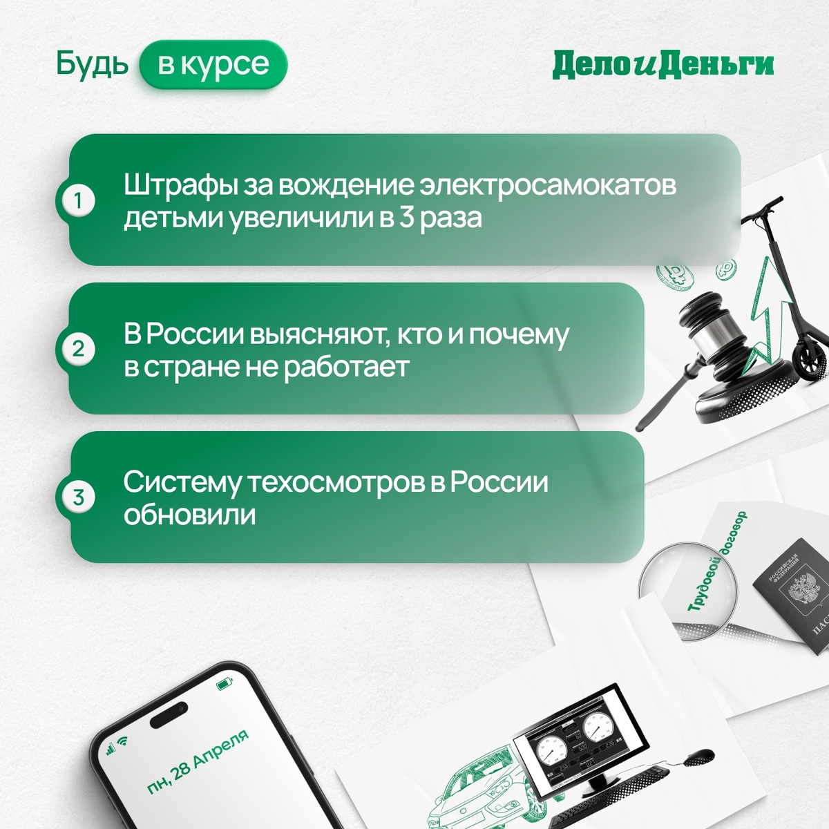 Штрафы за вождение электросамокатов несовершеннолетними выросили в 3 раза. С 28 апреля сервисы кикшеринга увеличили штрафы с 10 до 30 тысяч рублей, кроме Москвы, где штраф составит 100 тысяч. Компании приняли решение повысить штрафы исходя из собственной статистики: дети до 16 лет – самая аварийная категория. Правительство России разработало план мероприятий по борьбе с нелегальной занятостью на 2025-2027 годы. В рамках этого плана предусмотрены меры, направленные на стимулирование занятости среди трудоспособных граждан, не имеющих работы. Государственные органы проанализируют ситуацию, чтобы определить количество людей, не занятых трудовой деятельностью, и выяснить причины. С 28 апреля в России вводится обновленная система техосмотра автомобилей, включающая цифровые диагностические карты и фотофиксацию всех этапов проверки. Сотрудники станции обязаны делать фото государственного номера машины, ее VIN-кода, марки, модели и цвета. Теперь карта будет электронной, что упростит документооб