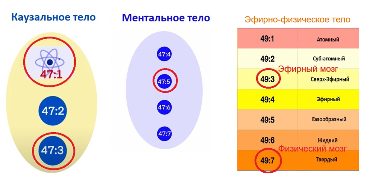Переориентация, которая требуется в наших оболочках, заключается в том, что необходимо установить контакт между ментальным атомом 2-й триады (47:1) и закреплением, которое 2-я триада уже имеет в человеческом мозге, через коронную чакру. Существует два энергетических потока человеческого развития. Первый определяется как интеллектуальная деятельность, которая функционирует через центры сознания 47:1, 47:3, 47:5, 49:3 и 49:7. Только что был представлен ряд чисел. Давайте рассмотрим их на минуту. Интеллектуальная деятельность имеет свой генезис в высшем центре ментальной оболочки 47:1. Это имеет смысл. Интеллект связан с ментальной деятельностью. Затем этот фокус смещается на нижний из двух молекулярных подуровней каузальной оболочки, 47:3. Затем он переходит на 47:5, высший уровень в ментальной оболочке, доступный человеческой монаде. Поскольку мы говорим о менталитете, эмоциональная оболочка полностью пропускается. Мы приходим к 49:3, месту расположения физического эфирного мозга, и, наконец, к самому физическому мозгу, 49:7.