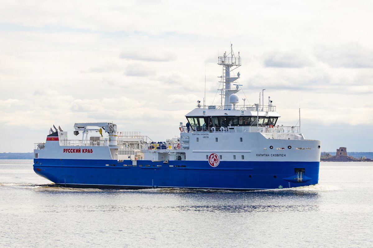 В Санкт-Петербурге 26 апреля успешно завершились ходовые испытания краболова-процессора «Капитан Сковпен» проекта CCa5712P. Испытания проходили в акватории Финского залива в районе острова Гогланд. В ходе проверок сдаточная команда оценивала работу всех систем и механизмов судна, а также его соответствие заявленным маневренным, ходовым и мореходным характеристикам. «Капитан Сковпен» стал последним судном в серии из трёх процессоров, построенных на Окской судоверфи по заказу ГК «Русский Краб». Первые два краболова — «Капитан Манжолин» и «Капитан Дудник» — уже поступили в эксплуатацию. Суда серии CCa5712LS могут перевозить до 120 тонн живого краба в девяти специально оборудованных танках, вмещающих 640 куб. м морской воды. Каждый танк оснащён системой Everflo, которая поддерживает необходимую температуру и очищает воду, обеспечивая надлежащие условия для транспортировки живого краба. Краболов «Кильдин» успешно спустили на воду на заводе ОСК «Красное Сормово» Для «Русского Краба»: в Петро