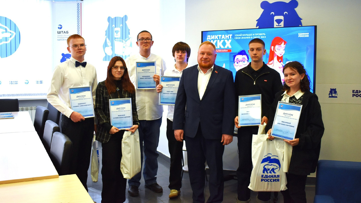 В Орле подвели итоги тематического диктанта. Депутат городского совета Алексей Чикин торжественно наградил лучших участников диктанта по жилищно-коммунальному хозяйству, организованного партией «Единая Россия». Победителями стали Павел Чернышов, Даниил Ведяшкин, Филипп Анютин, Виктория Писарева, Евгений Бобков и Карина Рыкова. Они набрали наибольшее количество баллов за наименьшее время. Победители получили заслуженные дипломы и памятные подарки. «Диктант ЖКХ» - мероприятие в рамках проекта «Школа ЖКХ», организованного партией «Единая Россия». Цель акции и проекта в целом - повышение правовой грамотности граждан в вопросах, связанных с предоставлением коммунальных и жилищных услуг.