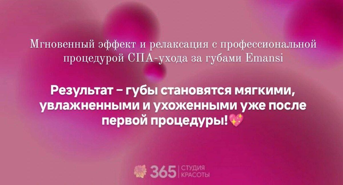Хочешь профессиональный уход и мгновенное восстановление губ 💋? Если хочется мгновенного эффекта и релаксации, попробуйте профессиональную процедуру СПА-ухода за губами Emansi, в нашей Студии 365 у косметолога Светланы☀️ ✨ Что вас ждет? ✅ Глубокое очищение и нежный пилинг или скраб для удаления сухих частиц ✅ Интенсивное питание с коллагеном и маслами ✅ Увлажняющая маска для восстановления мягкости и гладкости ✅ Финальный уход, создающий защитный барьер от холода Результат – губы становятся мягкими, увлажненными и ухоженными уже после первой процедуры! 💖 Записывайся прямо сейчас и подари своим губам заботу, которую они заслуживают! 💋✨ Специальная цена процедуры 700₽ ЗАПИСАТЬСЯ МОЖНО ЛЮБЫМ УДОБНЫМ СПОСОБОМ: 👉🏻 Сообщение в Whats'app https://wa.me/79663654477 👉🏻По телефону +79663654477 👉🏻Онлайн запись https://n286444.yclients.com/