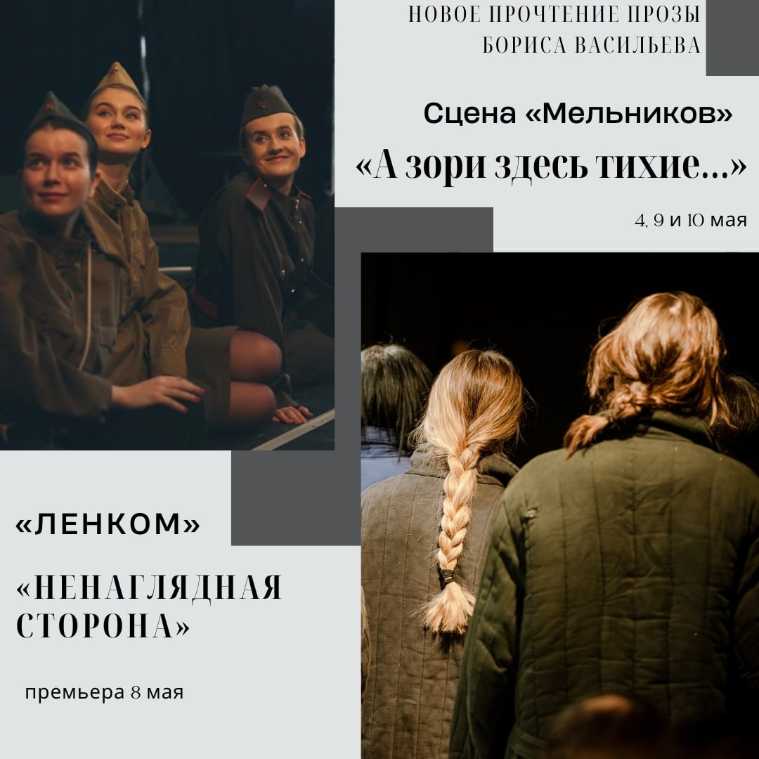Московские театры готовят новое прочтение прозы Бориса Васильева ⭐️ К 80-летию Победы сразу две большие столичные площадки представят спектакли по повести «А зори здесь тихие...» (1969) – «Ленком Марка Захарова» и Сцена «Мельников». Над премьерами работают очень разные режиссёры, но задача у них одна – сократить дистанцию между зрителем и давно знакомым сюжетом. Расскажем об этих постановках в порядке их появления на сцене. Первой выступит Сцена «Мельников». Спектакль «А зори здесь тихие...» сыграют 4, 9 и 10 мая. Как это заведено в коллективах под руководством Константина Богомолова, показы позиционируются как «предпремьерные». Над постановкой работает Антон Оконешников. «В повести Бориса Васильева очень красиво и художественно показана грань жизни и смерти. Ты не всегда понимаешь, по-настоящему ли что-то уже произошло или это героям только кажется. То, как девушки погибают, описано удивительно, в этот момент Васильев рассказывает подробные истории их жизни – и это очень важно для