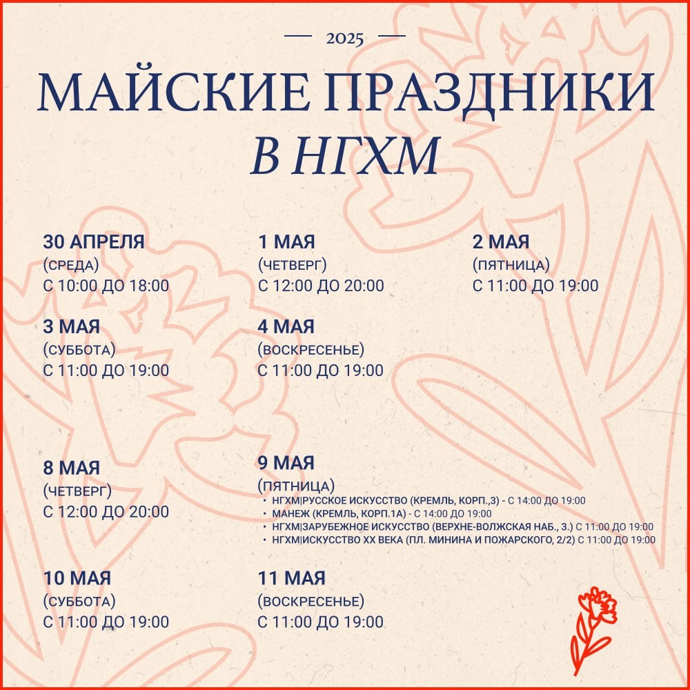 #графикработы 🌷Майские праздники в НГХМ: график работы всех зданий музея До первых майских дней осталось совсем мало времени. Некоторые уже составили планы на долгожданные длинные выходные. Отрадно, что многие из вас хотят посетить и НГХМ: постоянные экспозиции, выставки, лекции и экскурсии. Рассказываем, как музей будет работать с 30 апреля до 11 мая 2025 года. ☀️30 апреля 2025 года все здания НГХМ работают с 10:00 до 18:00 ☀️1 и 8 мая 2025 года все здания НГХМ (в том числе и Манеж Нижегородского кремля) работают с 12:00 до 20:00 ☀️2, 3, 4, 10 и 11 мая 2025 года все здания НГХМ работают с 11:00 до 19:00 ☀️9 мая 2025 года НГХМ работает в особом режиме: НГХМ|РУССКОЕ ИСКУССТВО (Кремль, корпус 3) и выставочная площадка НГХМ|МАНЕЖ (Кремль, корпус 1А) будут работать с 14:00 до 19:00 НГХМ|ЗАРУБЕЖНОЕ ИСКУССТВО (Верхневолжская набережная,3) и НГХМ|ИСКУССТВО XX ВЕКА (пл. Минина и Пожарского, 2/2) будут работать с 11:00 до 19:00 ☀️5 мая 2025 года — выходной день в музее Желаем вам прекра