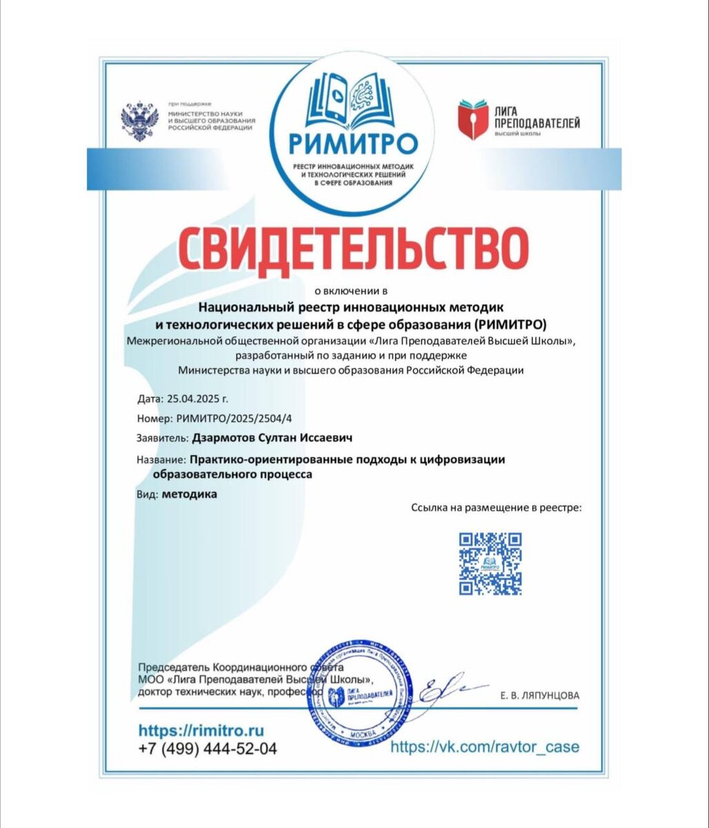 📈Достижение в сфере образования! Методика «Практико-ориентированные подходы к цифровизации образовательного процесса», разработанная старший преподаватель кафедры «Агрономия и МСХ» Дзармотов Султан Иссаевич, был включен в Национальный реестр инновационных методик и технологических решений в сфере образования (РИМИТРО). 🔵 Данная методика получила поддержку Министерства науки и высшего образования РФ и МОО «Лига Преподавателей Высшей Школы». Это достижение подчеркивает важность и актуальность предложенного подхода к цифровой трансформации образовательного процесса на федеральном уровне. 🔥Поздравляем Султана с этим значимым успехом и уверены, что его работа внесет значительный вклад в развитие образовательной среды! 🔵 Подписаться на ИнгГУ