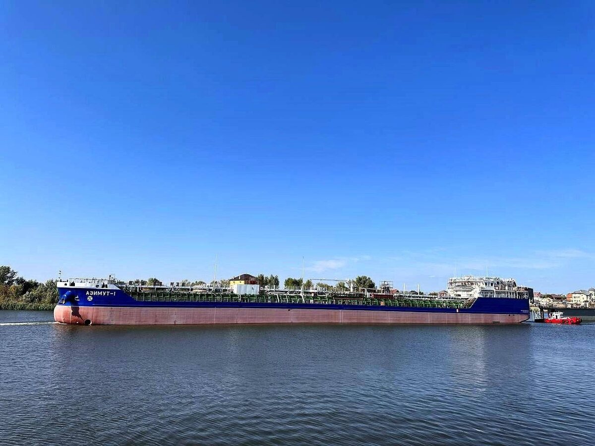 «Азимут – 1» - второе судно данного проекта, строительство которого велось на астраханской верфи ОСК. Первый танкер-химовоз проекта 00216М передан в эксплуатацию в 2023 году. Фото: ОСК. Акт приема-передачи судна подписан с компанией «Евразия-Шиппинг Каспий». Танкер смешанного плавания «река-море» спроектирован Невским проектно-конструкторским бюро ОСК. Грузовое судно может использоваться для перевозки наливом сырой нефти и нефтепродуктов без ограничения по температуре вспышки паров, патоки, а также вредных жидких веществ, включая те, которые требуют подогрева до температуры 60 °C. В одном рейсе могут перевозиться три сорта груза. Перевозка нефтепродуктов предусматривается в грузовых и отстойных танках, растительных масел – только в грузовых танках. Длина танкера – 141,0 м., ширина – 16,7 м., высота борта – 6,0 м., автономность – 15 суток, скорость – около 10 узлов, экипаж/количество мест – 12/13 чел.