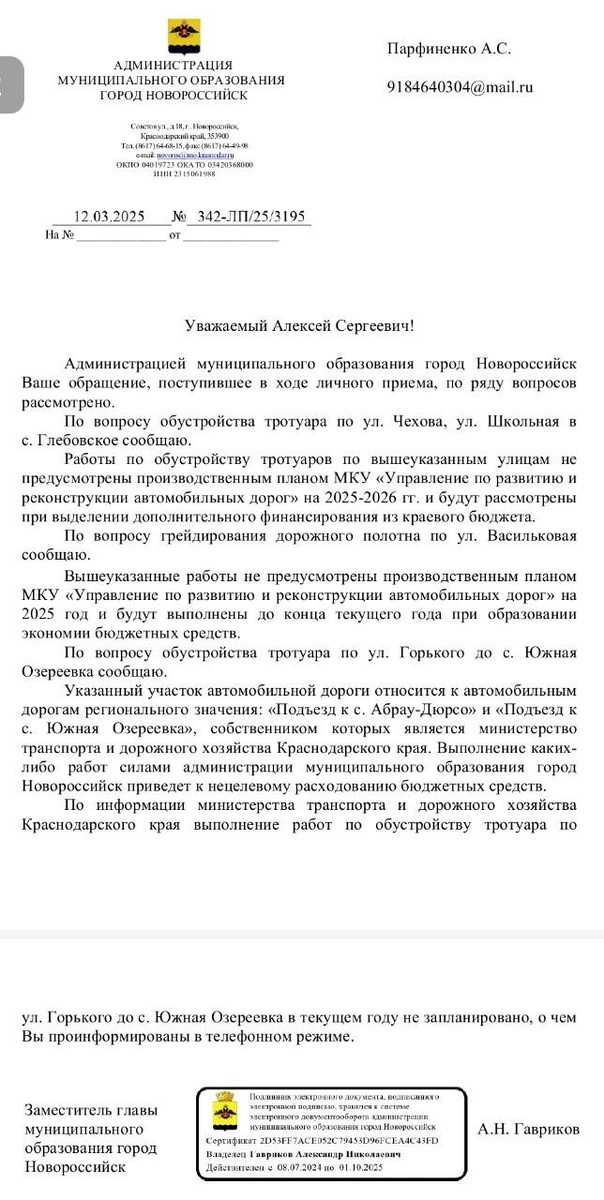 🥺Обучаю нового заместителя грамотно давать ответы гражданам города⚪️ В то время как чиновники администрации города-героя Новороссийска, в лице Гаврикова А.Н., не могут или не хотят грамотно рассматривать обращения граждан согласно ФЗ-59, приходится обращаться в органы прокуратуры. Они-то уж умеют обучать чиновников соблюдать действующее законодательство: сотрудники прокуратуры инициировали привлечение заместителя главы к административной ответственности по ст. 5.59 КоАП РФ, а также вынесли представление главе города об устранении нарушений. Спасибо сотрудникам прокуратуры! 🤝 📢Алексей Парфиненко 📲 @nvrsk_online