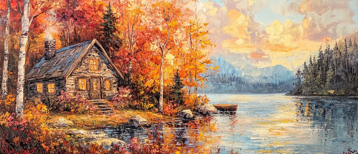 Создано на основе запроса: Cozy cottage by a crystal-clear lake, vibrant autumn leaves, oil painting with thick brushstrokes, cozy vibes