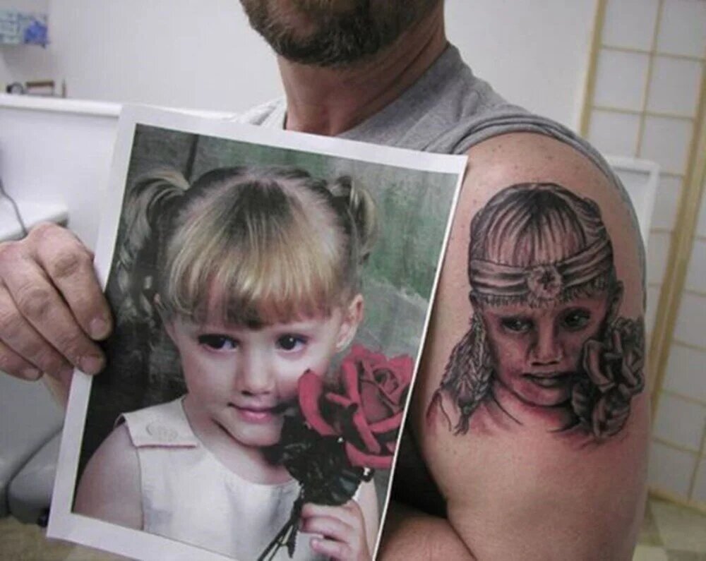Когда родительская любовь переполняет сердце, хочется запечатлеть образы своих детей навсегда. Именно такой благородный замысел стоял за этой татуировкой: милые портреты двух девочек, запечатленных на нежных фотографиях, должны были стать символом вечной связи. На бумаге они выглядят словно ангелы: сияющие глаза, лёгкие улыбки, нежные локоны. Но когда дело дошло до воплощения на коже, что-то пошло сильно не так.
