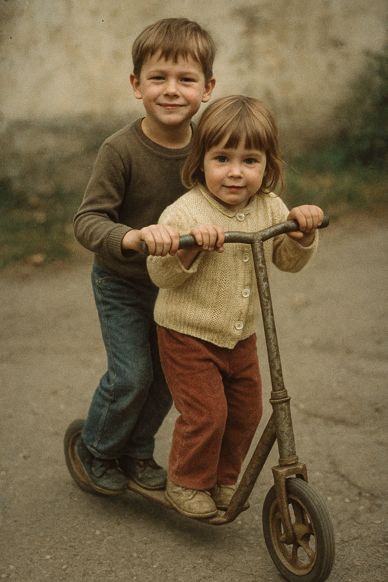 История одного заказа: 🛴⏳ Матвей заказал картину для своих детей — брата Вани и сестры Маши. «Они нашли в гараже старый самокат, и решили, что он — машина времени. Стоит только хорошенько разогнаться — и можно попасть в любое время, которое пожелаешь.» — написал Артём. Мы захотели передать этот детский азарт и жажду приключений. На картине: – Ваня и Маша вдвоём едут на старом, немного скрипучем самокате по пустынной улице, – Но вместо обычной дороги — вокруг них начинает меняться мир: в одну сторону уносится эпоха динозавров с ревущими ящерами среди джунглей,в другую — каменные замки средневековья и рыцари в блестящих доспехах,дальше — города будущего с летающими машинами и сверкающими башнями, – От колёс самоката тянется светящийся след, похожий на дорожку метеорита, – На лицах детей — искренняя радость и удивление, волосы развеваются на ветру. На картине волшебная надпись: "Скорость мечты измеряется не километрами, а чудесами на минуту." Когда Матвей подарил картину детям, они д