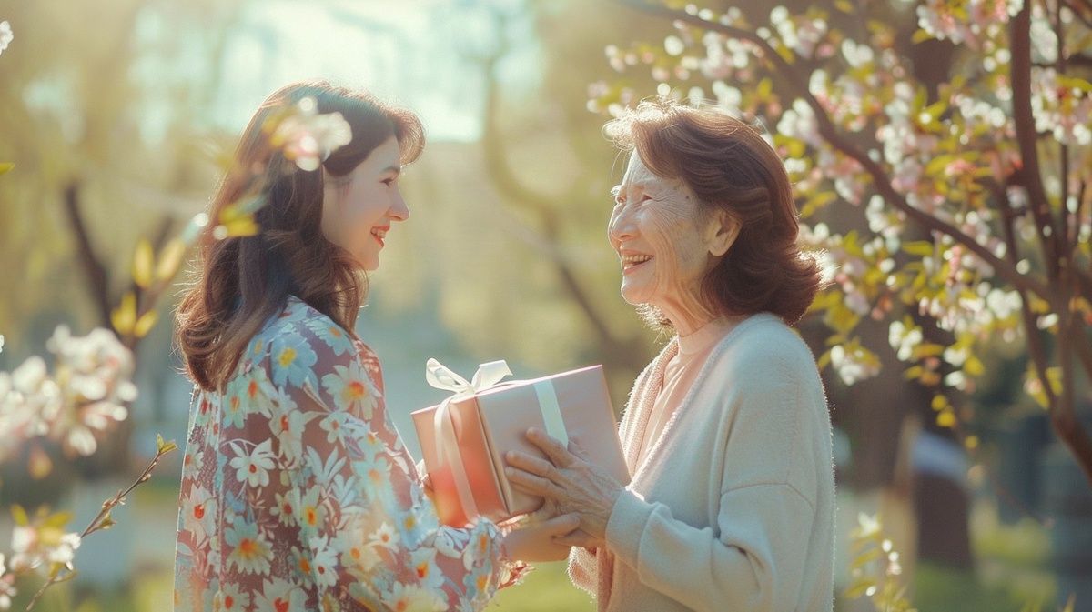 Создано на основе запроса: Young daughter giving her elder mother a beautifully wrapped spring gift, both smiling warmly at each other