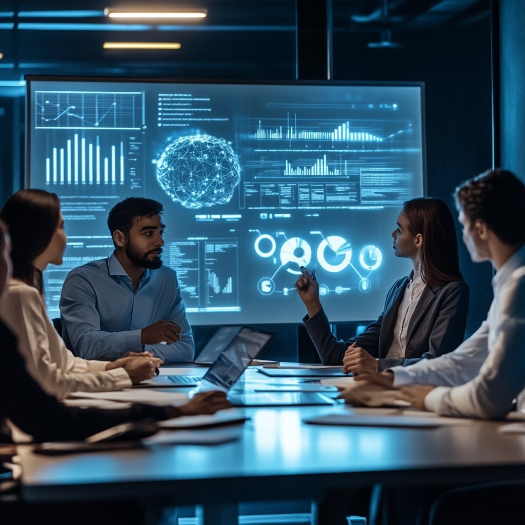 Создано на основе запроса: a diverse team of people working in a board room. business process workflows are shown on the whiteboards in the room. A projector displays a futuristic visualization of an AI application. Well lit room. --- Автоперевод: Разнообразная команда людей, работающих в зале заседаний. Как тебе такой вариант? 🤔 https://dzen.ru/id/65c0c65c86e4f837c27b24d7 #ИИ #AI #нейросеть #midjourney #art