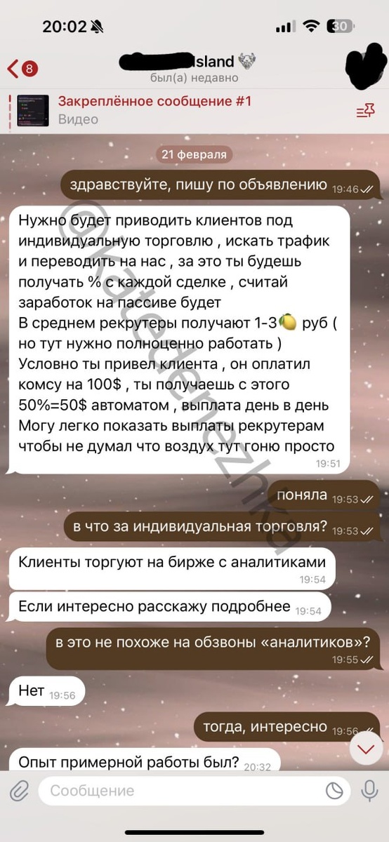 Я Кристина, мне 18 лет, студентка. В феврале я занялась поиском подработки, смотрела публикации и на Авито, на hh и в ТГ. В ТГ наткнулась на объявление о поиске личного ассистента на неполный рабочий день и удаленно. Написала. Мне рассказали суть работы. Я должна была писать людям, которые торгуют на криптобиржах с предложением о личной работе с аналитиком на определенных условиях. Я так писала несколько дней, но удалось только одну девушку перевести на аналитика, которая и рассказала мне, чем я на самом деле занимаюсь: помогаю мошенникам обманывать людей. Я едва не стала соучастницей в мошенничестве. Хотя они так и не признались, что они мошенники. Я потратила свое время. Они мне обещали выплатить 3500 рублей, но просто кинули в игнор. А если бы и что-то выплатили, то это было бы с украденных у других денег. Дисклеймер: Здравствуйте, я Катя Денежкина и на этом канале я разоблачаю обманы, связанные с онлайн-заработками. Все истории на канале - абсолютно реальны и рассказаны мне из перв
