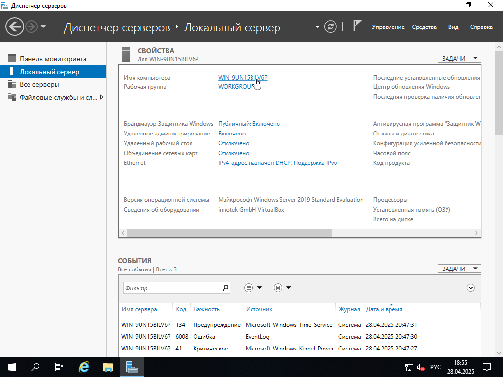 После установки Windows Server 2019 необходимо сменить имя сервера. После загрузки системы откроется "Диспетчер серверов", слева выберем "Локальный сервер" и нажмем на имя компьютера которое было сгенерированно автоматически Нажимаем "Изменить" Вписываем "Имя компьютера" и нажимаем "ОК" Нажимаем "ОК" Нажимаем "Закрыть" Нажимаем "Перезагрузить сейчас" и дожидаемся перезагрузки сервера Опять переходим в "Локальный сервер" и выбираем поле "Ethernet" Нажимаем правой кнопкой мыши по сетевому интерфейсу и выбираем "Свойства" Выбираем "IP версии 4 (TCP/IPv4)" и нажимаем "Свойства" Переключаем на "Использовать следующий IP-адрес", вписываем "IP-адрес", "Маска подсети", "Основной шлюз", а так же в поле "Предпочитаемый DNS-сервер" и "Алтернативный DNS-сервер" вписываем IP адреса DNS серверов. Нажимаем "ОК" Если вы не используете "IP версии 6 (TCP/IPv6)" можно его отключить убрав галочку. Нажимаем "Закрыть" Закрываем окно "Сетевые подключения" Нажимаем на значение в поле "Центр обновления Windows