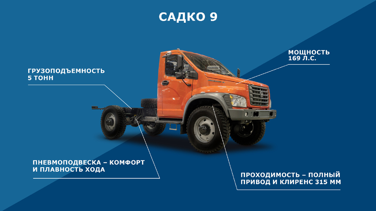 Не секрет, что у Горьковского автозавода за много лет накоплена солидная экспертиза в разработке и производстве внедорожных грузовых автомобилей. Достаточно вспомнить ГАЗ-66, получивший массу лестных отзывов за свою феноменальную проходимость. Машина выпускалась 35 лет и разошлась по миру тиражом почти в миллион экземпляров. Ее выдающиеся характеристики нашли свое отражение в более поздних моделях: ГАЗ-3308 «Садко», ГАЗ-33086 «Земляк» и, наконец, «Садко NEXT». Сегодня мы хотим познакомить вас с новым представителем внедорожной линейки – грузовиком «Садко 9». Это наша главная новинка 2025 года. Автомобиль не замещает, а дополняет серийную модель «Садко NEXT». Он предлагается в двух вариантах колесной базы – 3770 мм и 4515 мм, с однорядной или двухрядной кабиной и предназначен для тех, кому требуется увеличенная грузоподъемность на бездорожье. В чем же состоят основные отличительные особенности и преимущества новинки в сравнении с уже хорошо известным «Садко NEXT» и прямым предшественни