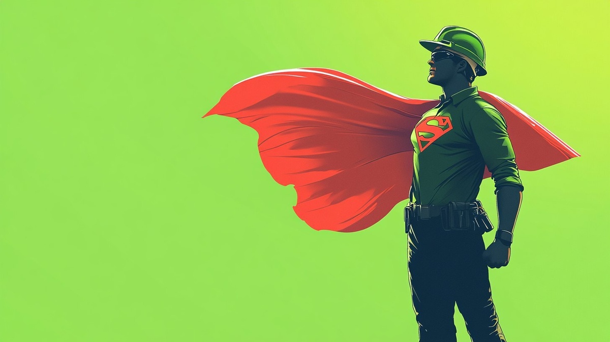 Создано на основе запроса: A heroic worker standing proudly, wearing a bright green helmet and a flowing red Superman-style cape