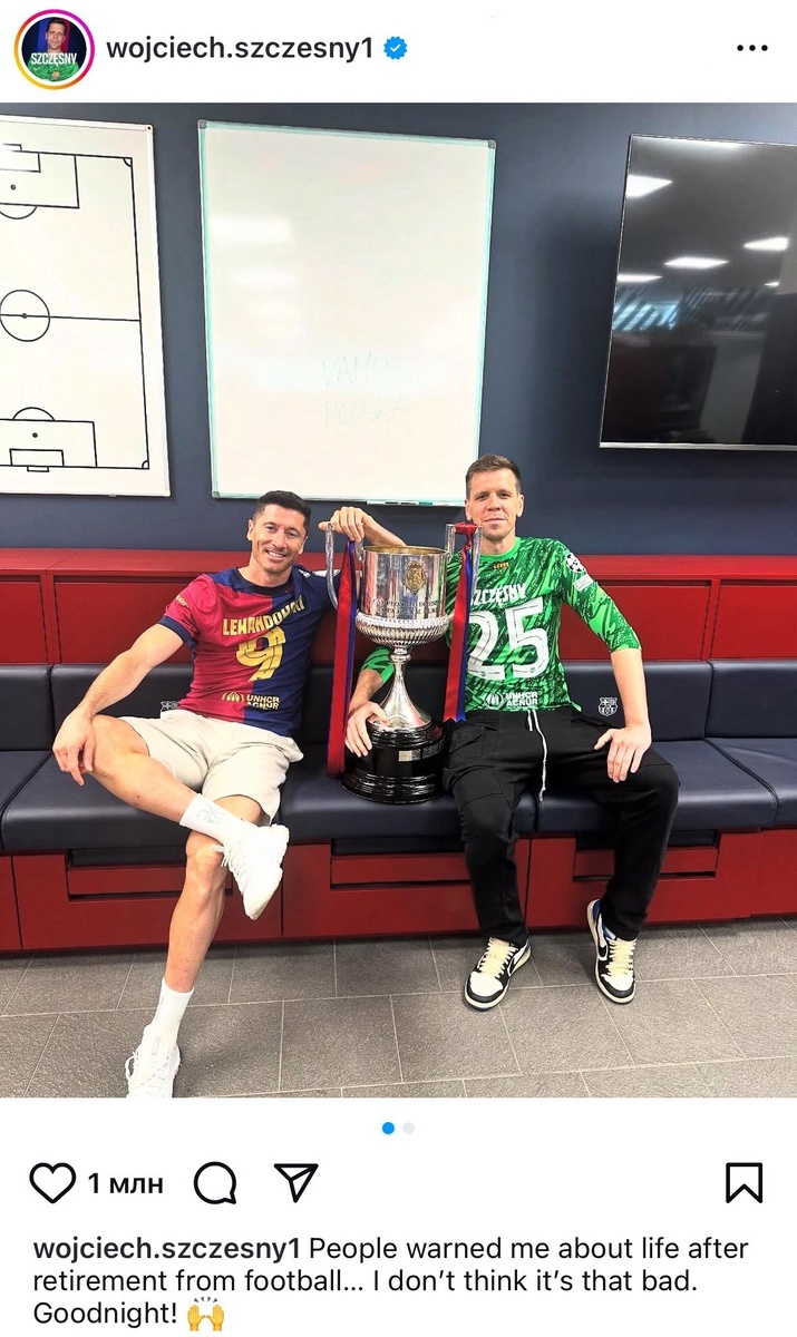 По поворотам карьеры Войчеха Шченсного можно писать сценарий для фильмов. Летом 2024-го поляк завершил карьеру, а под конец сезона-2024/25 он может взять требл в качестве основного вратаря «Барселоны». В копилке трофеев Войчеха с «блауграной» уже был Суперкубок Испании, теперь поляк добавил в коллекцию Кубок страны. На правах главного шутника команды, Шченсны с юмором прокомментировал победу в кубковом класико: «Меня предупреждали о жизни после ухода из футбола… Не думаю, что все настолько плохо. Спокойной ночи! 🙌» Если бы не осечка в ответной встрече с дортмундской «Боруссией», Войчех мог обойти Йохана Кройффа в топе игроков «Барселоны», на счету которых самая длительная серия игр без поражений. В Ла Лиге «Барса» на четыре очка оторвалась от «Мадрида» после 33-х туров, а в полуфинале Лиги чемпионов каталонцев ждет противостояние с «Интером». Сколько в итоге трофеев возьмет Шченсны, успевший завершить карьеру? 🎥 Войчех Шченсны назвал самых трудных соперников на тренировках «Барсы».