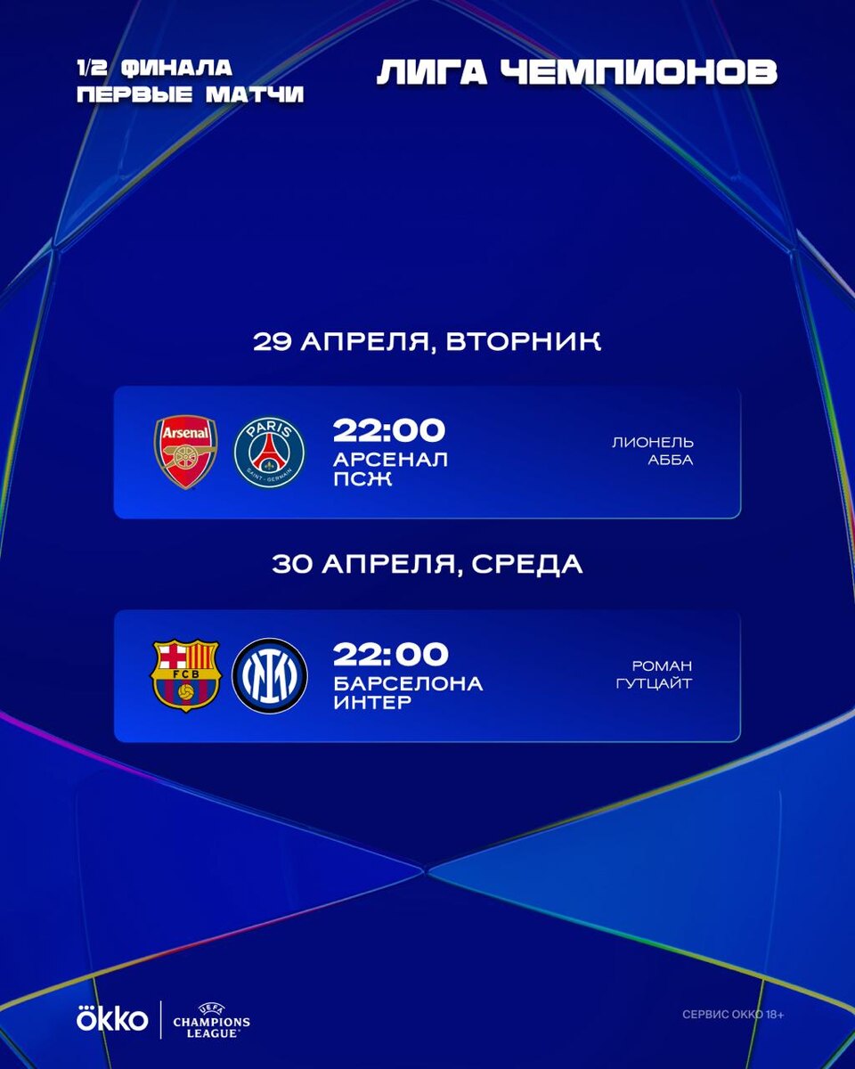 Полуфиналы Лиги чемпионов. Здесь лучшие из лучших 🔥 Уже завтра последим за встречей «Арсенала» и «ПСЖ». В среду – «Барса» против «Интера». 😄 Смотри еврокубки в Okko: https://okko.tv/s/hz5