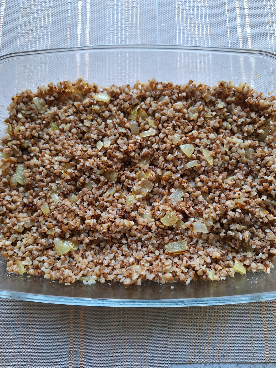 форму, смажем растительным маслом и выложить гречку смешанную с обжаренным луком.