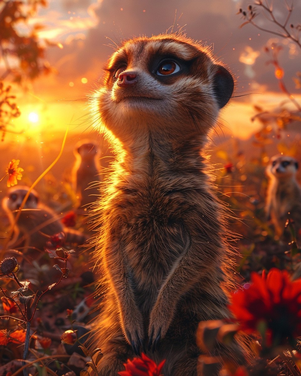 Создано на основе запроса: On a sun-drenched African savanna, a lively troop of meerkats plays while young Kiki gazes longingly toward the distant horizon, dreaming of the unknown, DreamWorks Animation 3-D cinematic style, vibrant warm palette, soft rim light, detailed fur textures
