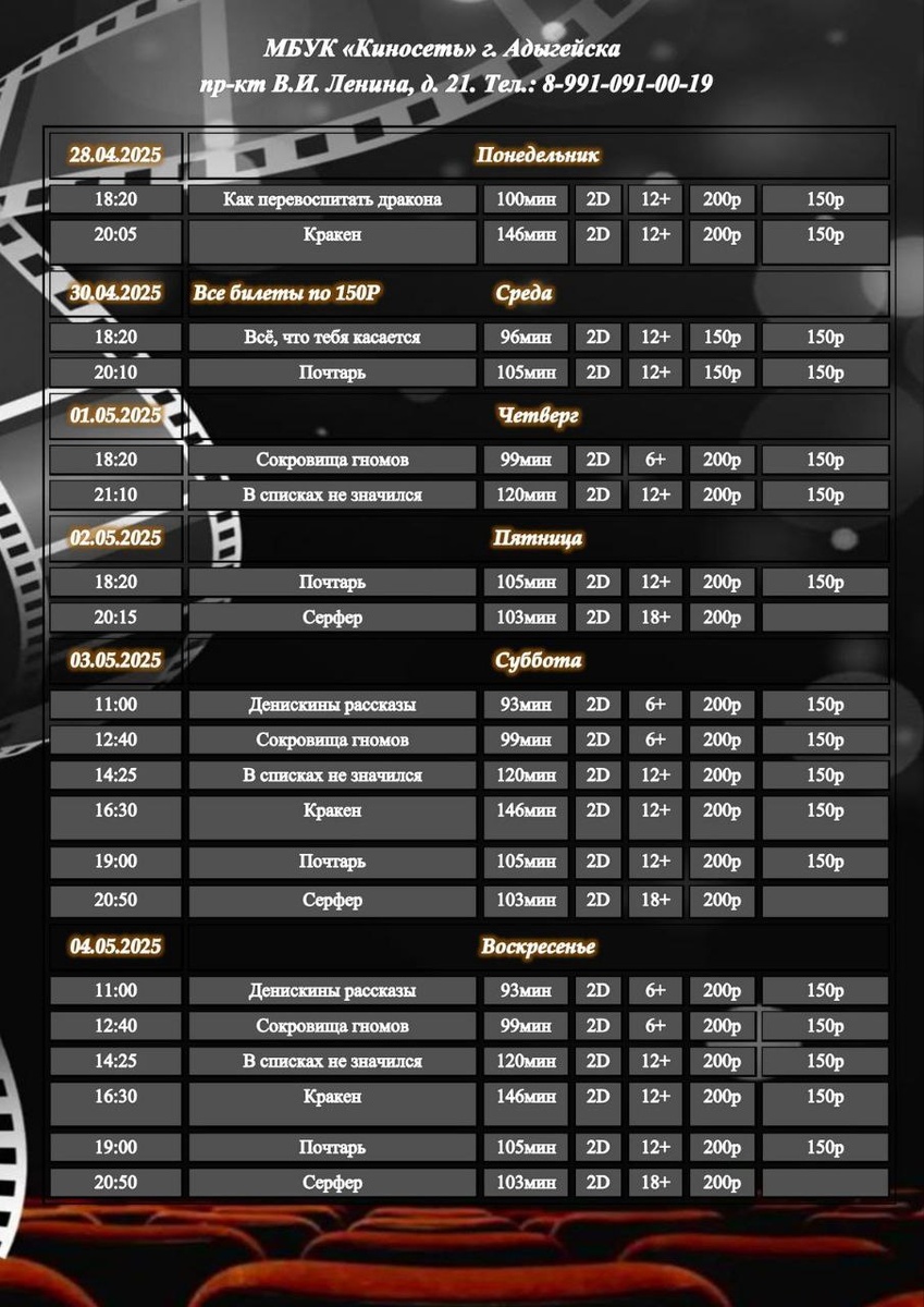 Расписание Кинозала г. Адыгейска с 28.04.2025 по 04.05.2025🎞 Купить билет онлайн можно по ссылке внизу 👇 https://clck.ru/32VTgE ___ Мы в социальных сетях: 🎞https://clck.ru/34TuU5 🎞https://clck.ru/34TuU6 🎞WhatsApp: 8-991-091-00-19 📱8-991-091-00-19