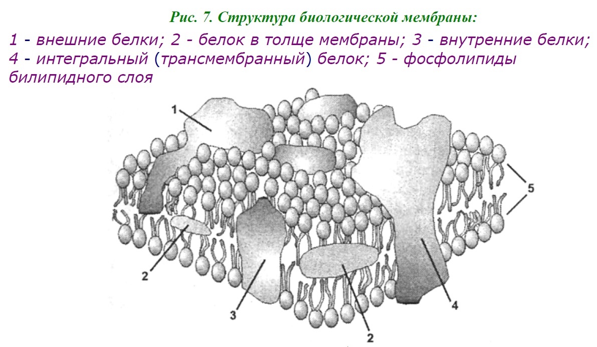 Наиболее полно строение биологических мембран отражает жидкостно-мозаичная модель, первоначальный вариант которой был предложен в 1972 г. Г. Николсоном и С. Сингером. Мембрана состоит из двух слоев амфипатических молекул липидов (билипидный слой, или бислой). Каждая такая молекула имеет две части - головку и хвост. Хвосты гидрофобны и обращены друг к другу. Головки, напротив, гидрофильны и направлены кнаружи и внутрь клетки. В билипидный слой погружены молекулы белка (рис. 7). На рис. 8 схематически представлена молекула фосфолипида фосфатидилхолина. Одна из жирных кислот -насыщенная, другая - ненасыщенная. Молекулы липидов способны быстро диффундировать в боковом направлении в пределах одного монослоя и крайне редко переходят из одного монослоя в другой. Билипидный слой ведет себя как жидкость, обладающая значительным поверхностным натяжением. Вследствие этого он образует замкнутые полости, которые не спадаются. Некоторые белки проходят через всю толщу мембраны, так что один конец мол