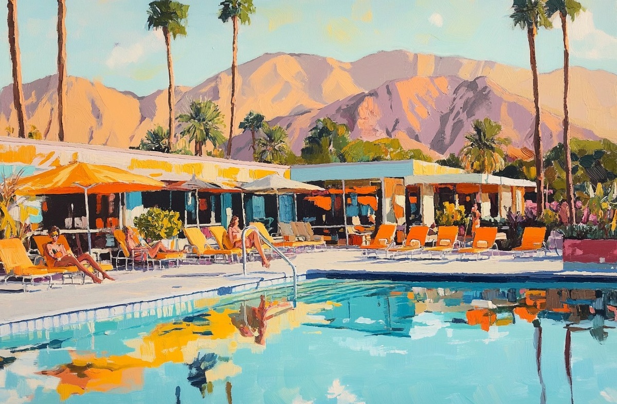Автоперевод: Палм-источники, мягкий свет в оранжевых и желтых оттенках, гладкие стулья вокруг бассейна, яркие цвета, современная архитектура середины века с некоторыми неоновыми огнями, пустынные горы на заднем плане и солнечные ванны.