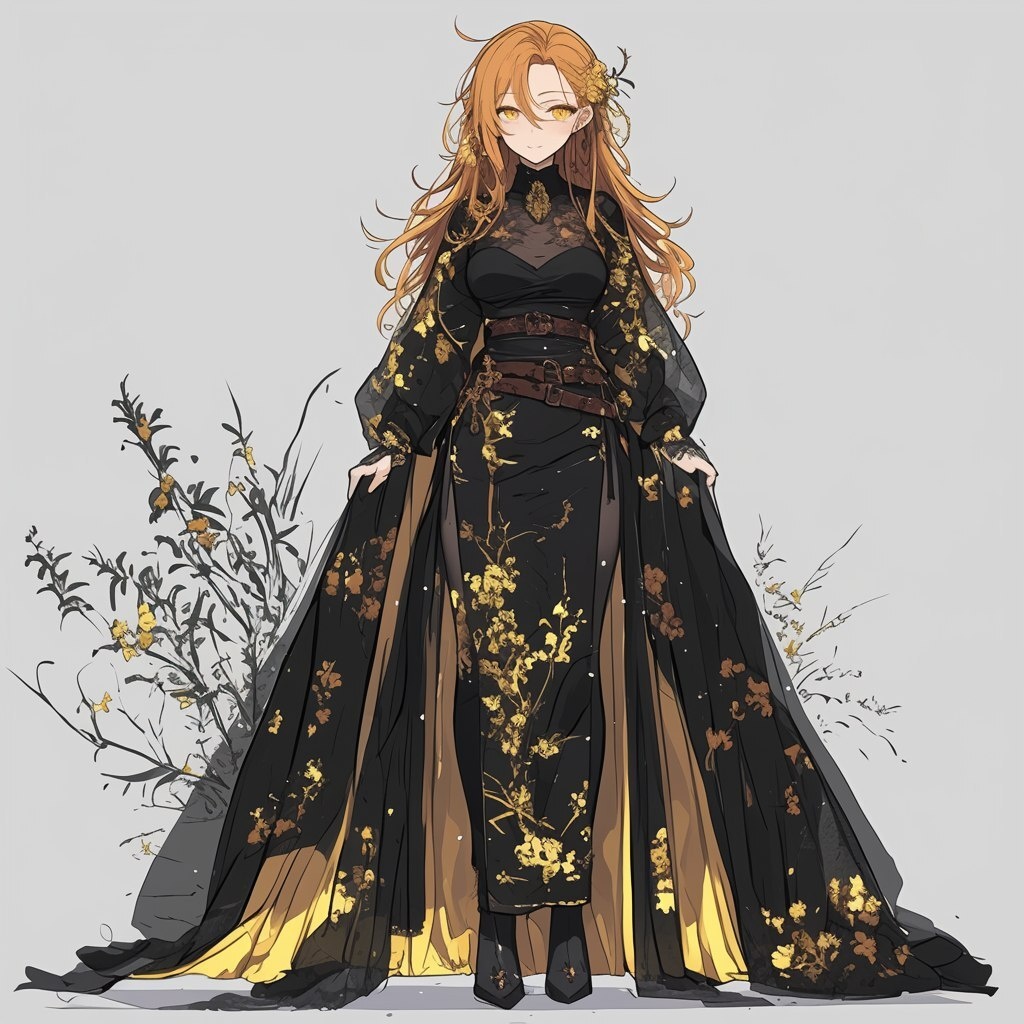 Создано на основе запроса: Standing at full height is a witch girl with yellow-brown hair dressed in beautiful clothes