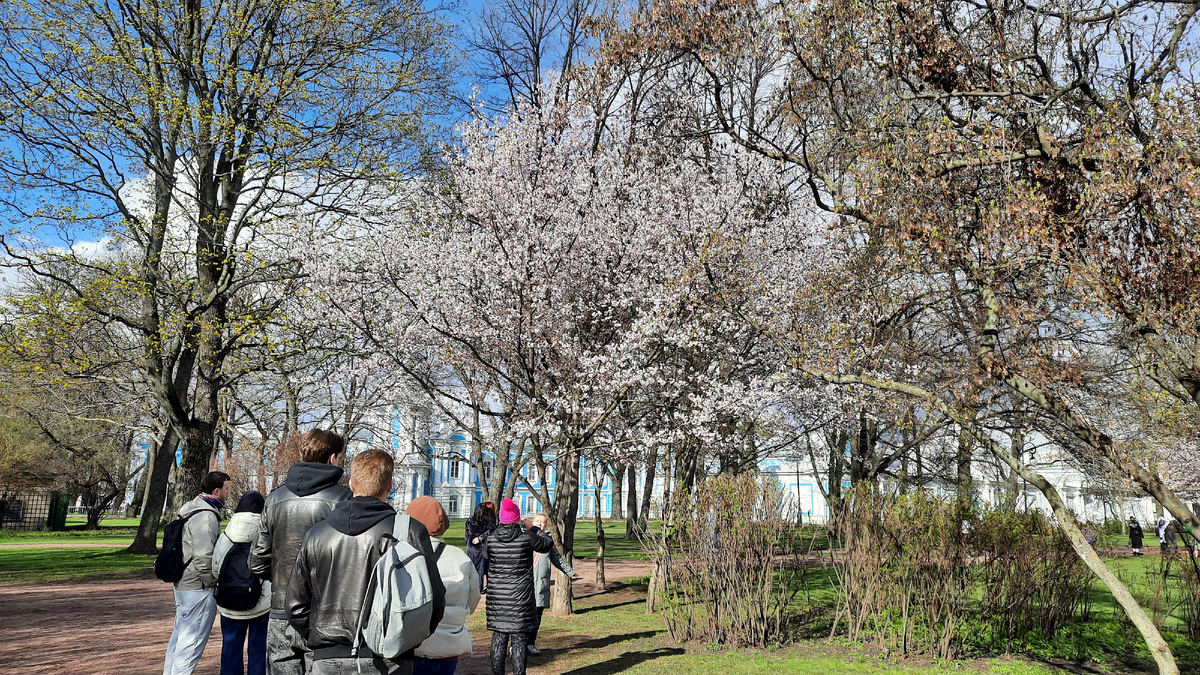 Здесь две делянки с сакурой слева от входа в сад-партер Смольного. Народа практически нет, если сравнивать с Литейный проспектом. Вторая группа деревьев в пятидесяти метрах от первой. Люди ведут себя прилично. Друг на друга не залезают, урны не тащут, ветки не нагибают. Место обязывает быть дисциплинированным. Сакура в самом соку. Не забываем смотреть на часы и небо. Наш сеанс подходит к концу. А надо ещё вокруг посмотреть. Четыре фонтана. Не хуже чем в Петергофе. Памятники Марксу и Энгельсу. В цен