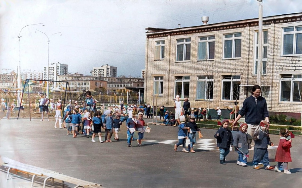 • История в красках • Времена, когда Кирово-Чепецк рос впечатляющими темпами. Когда жильё сдавать требовалось кварталами и микрорайонами, создавая и места для детей — детские сады и школы. На снимке: детский сад №12 в 1970-е годы. Как и ряд других дошкольных заведений, он оказался закрыт в новейшее время. И число жителей, и число детей в Чепецке уменьшается, многие учреждения закрыли в девяностые. И три — в последние пять лет. А учитывая динамику численности жителей, имеющихся дошкольных учреждений хватит, чтобы обеспечивать местами всех детей. Новый взгляд на знакомые страницы истории. Таким Кирово-Чепецк на исторических снимках редко увидишь — по нему будто прогулялись с цветным фотоаппаратом. Использовали алгоритмы с машинным обучением, чтобы «раскрасить» давно знакомые старые снимки Кирово-Чепецка и доработали их вручную.