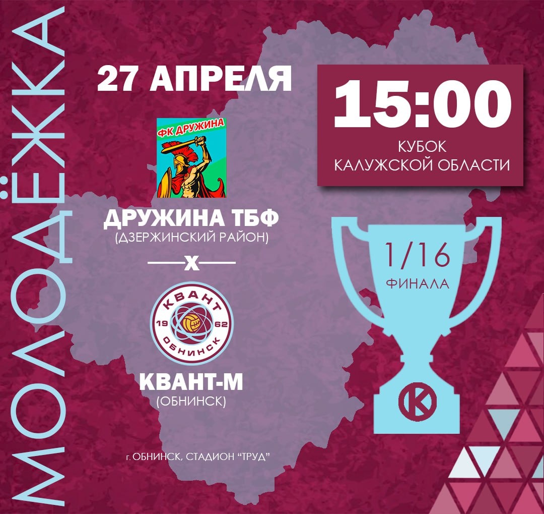 Завтра! В воскресенье 27 апреля футбол на стадионе Труд! Молодёжная команда ФК "Квант" стартует в розыгрыше Кубка Калужской области. В рамках 1/16 финала юноши сыграют с командой "Дружина ТБФ" из Дзержинского района. Формально матч для нас гостевой, но играем в Обнинске 😉 приходите на трибуны.