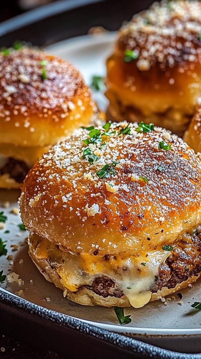 Создано на основе запроса: | Title: Golden-brown Garlic Parmesan Cheeseburger Bombs | Close-up Shot right view, taken by a photographer with