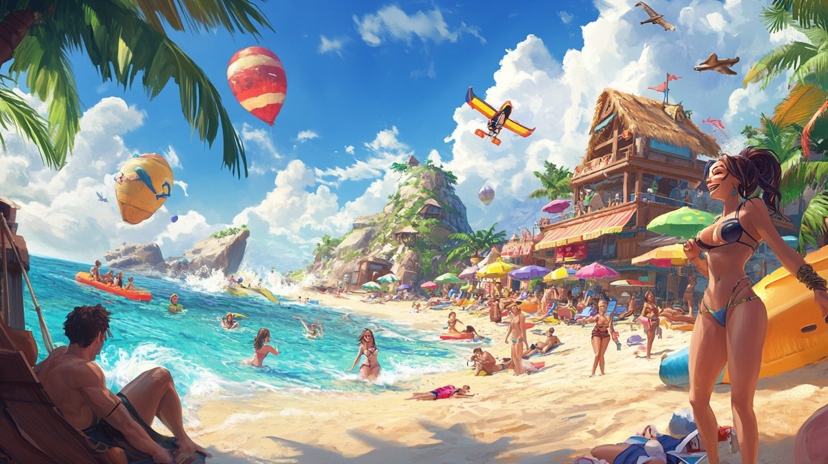 Создано на основе запроса: a picture set in the Fortnite universe of people on spring break having fun