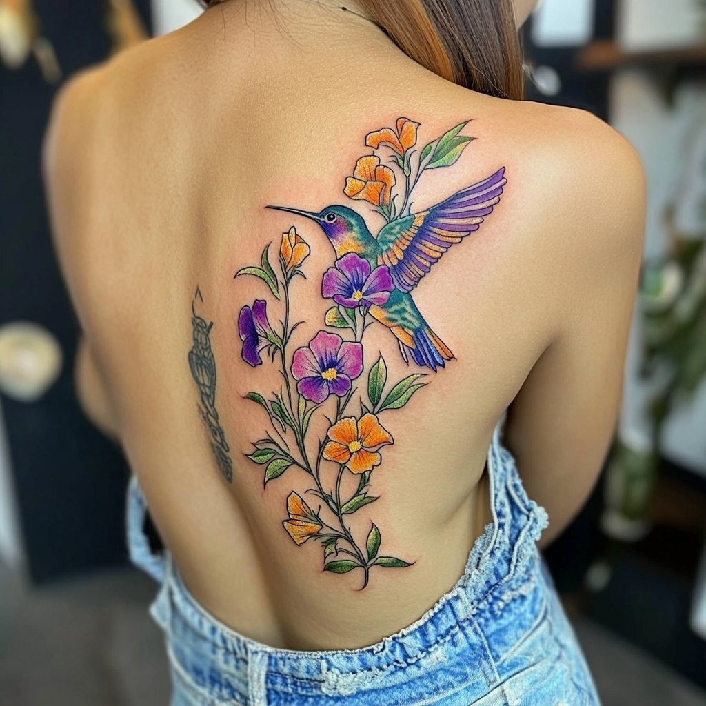Создано на основе запроса: a brightly colored tattoo of a hummingbird with sweet pea flowers