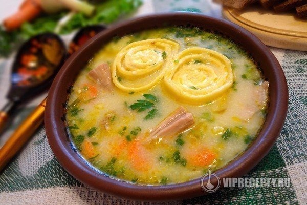 Куриный суп с сырными рулетиками Ингредиенты для супа: Куриный бульон 4 картофеля 1 морковь 1 луковица Зелень Ингредиенты для сырных рулетиков: 100-140 гр муки 100 гр плавленного сырка 1 яйцо Соль – щепотка Рецепт приготовления куриного супа с сырными рулетиками: Сначала в куриный бульон нужно отправить картофель и отварить его до полуготовности. По желанию, луковицу можете целиком отправить в бульон вместе с картофелем, или в дальнейшем пассеровать ее на сковороде вместе с морковью. Для сырных рулетиков яйцо взбиваем с солью, добавляем муку и вымешиваем тесто. Полученное тесто раскатываем в пласт и обильно посыпаем плавленным сырком. Тесто закручиваем в рулет и нарезаем на небольшие кусочки. В бульон добавляем сырные рулетики. Варим приблизительно 10 минут на медленном огне, чтобы избежать развариванию рулетов. Морковку пассеруем на растительном масле и добавляем в кастрюлю с супом. За 2-3 минуты до окончания приготовления добавляем в кастрюлю мелко рубленную зелень. Приятного а
