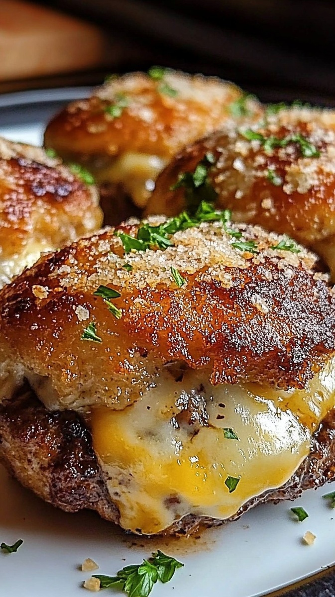 Создано на основе запроса: | Title: Golden-brown Garlic Parmesan Cheeseburger Bombs | Close-up Shot right view, taken by a photographer with