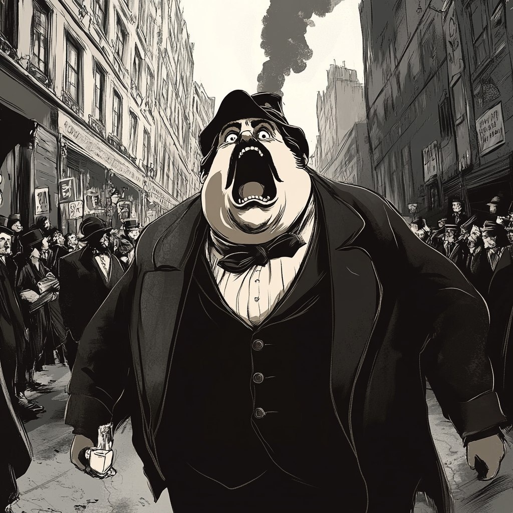Создано на основе запроса: simple illustration of a big fat man dressed in victorian clothes and moustache screaming in The middle of a