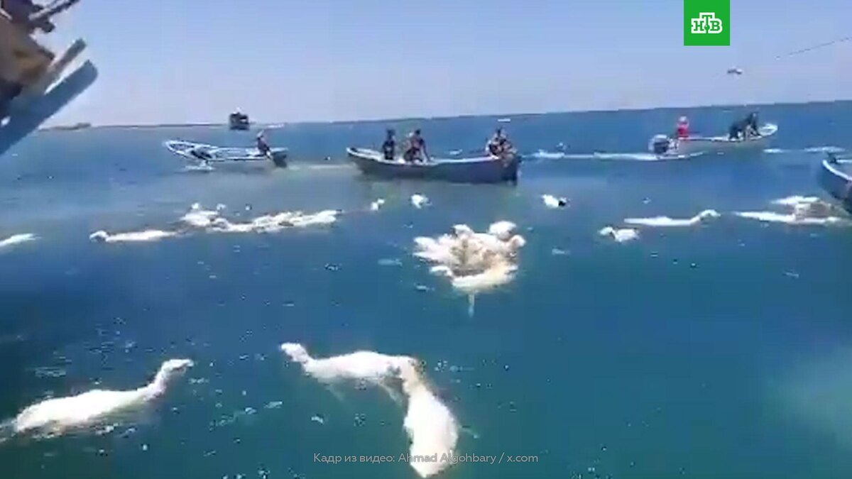 [ Смотреть видео на сайте НТВ ] Судно, перевозившее тысячи овец, терпит бедствие у берегов Йемена, на помощь членам экипажа и животным выдвинулись местные рыбаки. Об этом сообщило Yemen Press Agency. На кадрах с места событий видно, что судно сильно накренилось, часть животных оказалась в воде. Также на записи видно, что на месте ЧП находится множество моторных лодок. Находящиеся на них люди вытаскивают животных из воды. Что стало причиной ЧП с судном, не уточняется. [ Смотреть видео на сайте НТВ ]