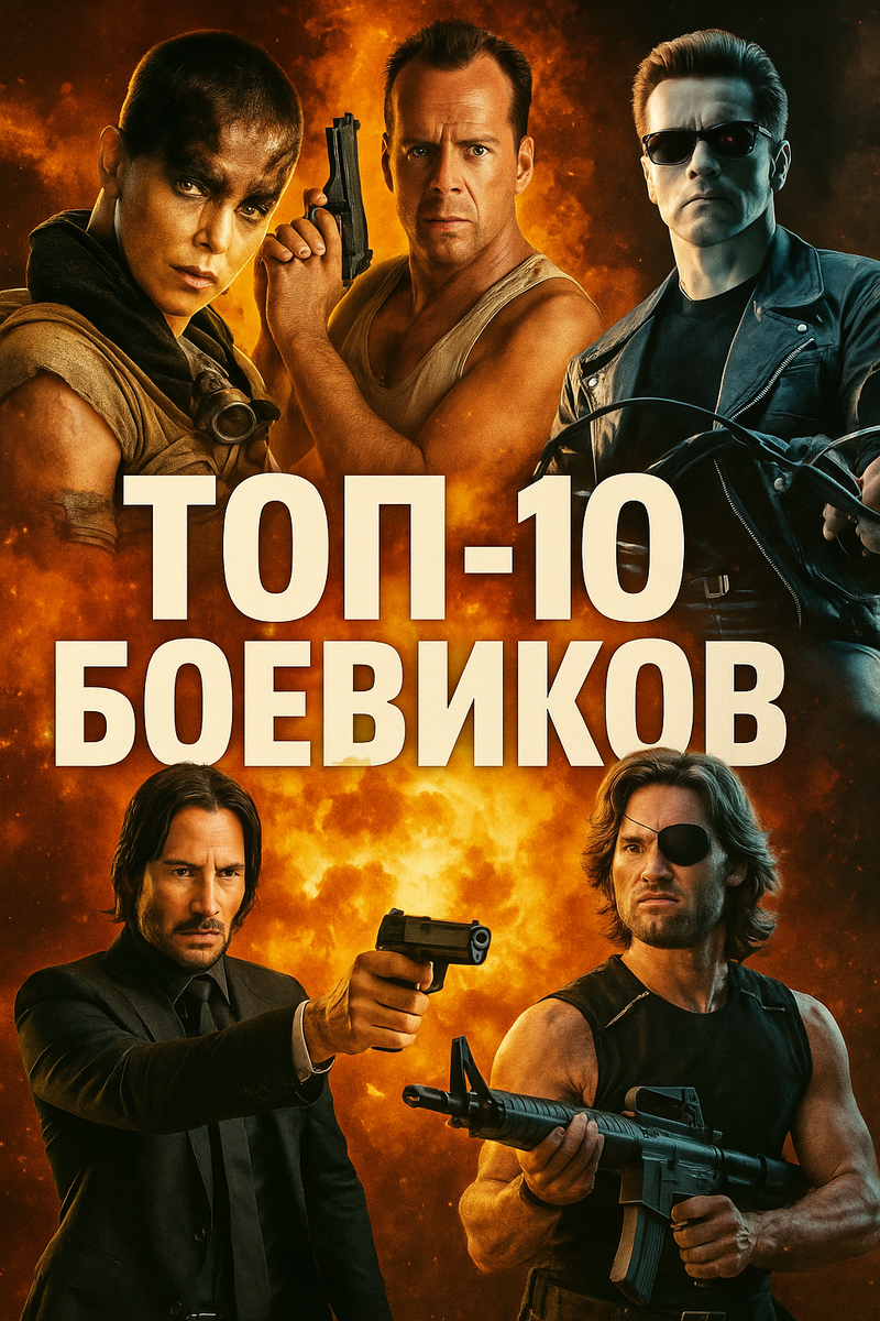 Стильный, мрачный и крайне зрелищный фильм, который вернул Киану Ривза в ранг суперзвезды. История о киллере, которого лучше не злить. Джон Траволта и Николас Кейдж меняются лицами — буквально. Мастерский экшен от Джона Ву с неповторимой хореографией боёв. Арнольд Шварценеггер в роли киборга-защитника. Идеальное сочетание научной фантастики и безудержного экшена. Индонезийский боевик, который поставил новую планку для сцен рукопашного боя. Жестокий, напряжённый и крайне динамичный. Брюс Уиллис в роли простого полицейского, оказавшегося один на один с террористами. Классика жанра. Квентин Тарантино и его брутальный взгляд на криминальный мир. Минимум локаций, максимум напряжения. Фантастический боевик-эксплозия: погони, безумные машины и невероятный визуальный стиль Джорджа Миллера. Третий фильм о Джейсоне Борне — напряжённый шпионский боевик с выдающимися сценами преследования и драки. Культовая антиутопия Джона Карпентера с харизматичным Куртом Расселом в роли Змея Плискина. Необычный